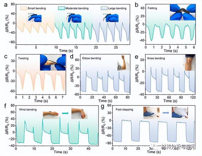 圖4. RGO@PU海綿傳感器在人體運動檢測的各種應(yīng)變中的應(yīng)用