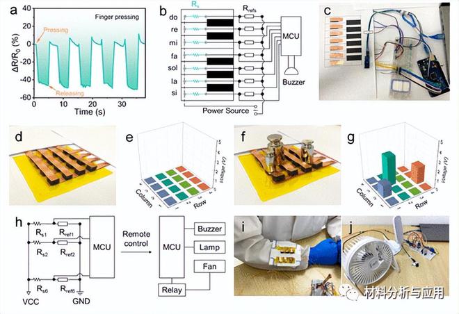 綜上所述,壓阻式傳感器由高彈性3D多孔PU海綿組裝而成,該海綿包裹有導(dǎo)電RGO層,在壓縮過程中提供導(dǎo)電路徑。當(dāng)受到外部刺激時,導(dǎo)電RGO層中的微裂紋、變形和海綿骨架的接觸會導(dǎo)致電阻變化,使海綿傳感器具有更高的靈敏度(17.65 kPa–1)和長期耐用性(8000 次循環(huán))。此后,傳感器可用于準確檢測有規(guī)律的人體運動(例如,手指彎曲、手腕彎曲),或識別具有不同輸出電信號的各種重量的物體。此外,集成傳感器陣列和信號采集電路應(yīng)用于柔性電子鋼琴制造、電子皮膚以及通過藍牙技術(shù)遠程實時控制家用電子產(chǎn)品,為柔性電子在智能應(yīng)用場景中提供了可行的嘗試。