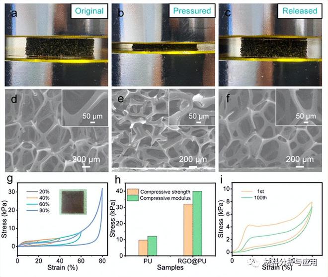 (g) RGO@PU海綿在壓縮應(yīng)變?yōu)?0%,變形率為56mm/分鐘,8000次循環(huán)下的長期穩(wěn)定性測試。