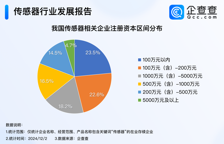 注冊(cè)資本方面,數(shù)據(jù)顯示我國傳感器相關(guān)企業(yè)以中小規(guī)模為主。其中,注冊(cè)資本在100萬元以內(nèi)的企業(yè)占比最高,達(dá)到23.5%,注冊(cè)資本在100萬元至200萬元之間的企業(yè)緊隨其后,占比22.6%。綜合來看,注冊(cè)資本在200萬元以內(nèi)的企業(yè)合計(jì)占比46.1%,成為主流。注冊(cè)資本在1000萬元至5000萬元之間的企業(yè)也占據(jù)一定比例,達(dá)到18.2%。