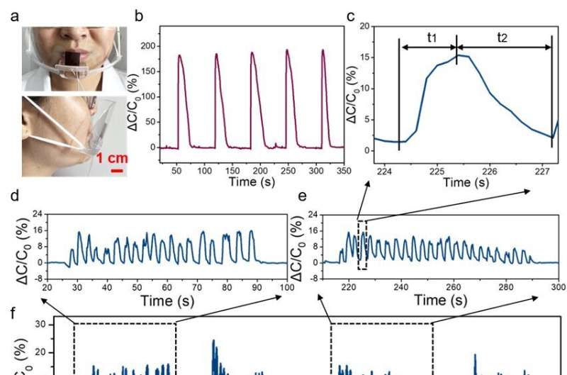 (a) 佩戴在受試者臉上的商用口罩上的濕度傳感器照片。(b) 受試者在休息狀態(tài)下用嘴進(jìn)行的人體呼吸測(cè)試。(c) 傳感器的響應(yīng)和恢復(fù)時(shí)間。(d)-(f) 受試者在休息狀態(tài)下用鼻子實(shí)時(shí)監(jiān)測(cè)呼吸頻率。實(shí)時(shí)監(jiān)測(cè)手掌濕度,(g) 飲用熱水時(shí)和 (h) 鍛煉時(shí)的情況。圖片來(lái)源:《光電子進(jìn)展》(2023 年)。DOI: 10.29026/oea.2023.220172