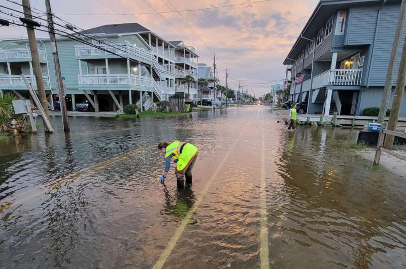 一項新研究發(fā)現(xiàn),沿海洪災(zāi)發(fā)生頻率遠超此前認知,且廣泛使用的利用潮汐數(shù)據(jù)捕捉洪災(zāi)的方法存在重大缺陷。圖片為研究人員在北卡羅來納州卡羅來納海灘采集洪水樣本。圖片來源:晴日洪水項目(Sunny Day Flooding Project)