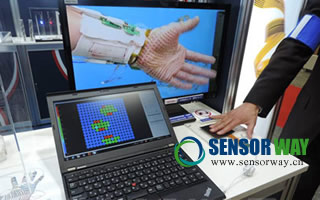合作開發(fā)的成果,是能夠粘貼在曲面上使用的“柔性觸覺傳感器”。筆者在采訪中看到了相關(guān)演示,人體模特的手上粘滿了傳感器,僅一只手上,傳感器的數(shù)量就達(dá)到了1000個(gè)。人體模特的手顯示在電腦屏幕上,與滿是傳感器的手一接觸,屏幕上就能看到相應(yīng)的接觸點(diǎn)被點(diǎn)亮,對(duì)于不同大小的壓力,點(diǎn)亮的顏色也不同,例如壓力強(qiáng)的地方呈現(xiàn)紅色、壓力弱的地方呈現(xiàn)綠色。如果將人類握手時(shí)感受到的壓力“可視化”,估計(jì)也是這樣的感覺,F(xiàn)在能夠檢測(cè)的壓力范圍是每平方厘米10克至數(shù)千克。