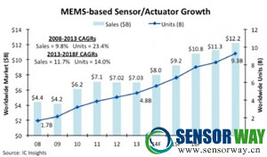 根據(jù)IC Insight的報告,在經(jīng)歷了增速趨緩之后,MEMS傳感器市場重回升勢。主要原因是新一代的設(shè)備和應(yīng)用的發(fā)展,包括多傳感器平臺、物聯(lián)網(wǎng)以及可穿戴設(shè)備。