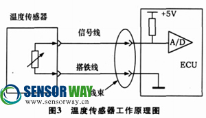 電控柴油發(fā)動(dòng)機(jī)上使用的溫度傳感器為二線式熱敏式溫度傳感器, 其外形如圖2所示。隨著溫度的升高, 熱敏電阻的阻值降低, 正常情況下阻值在500Ω~40kΩ之間變化, 表1所示為一個(gè)典型的康明斯溫度傳感器參數(shù), 具體參數(shù)值請(qǐng)參照隨電路圖提供的傳感器技術(shù)參數(shù)表。圖3為溫度傳感器的工作原理圖。隨著溫度的升高, 熱敏電阻值降低, 從而使信號(hào)電壓降低, 根據(jù)溫度傳感器的工作原理, 可以用檢查熱敏電阻阻值的方法檢查溫度傳感器, 通過(guò)對(duì)比實(shí)際測(cè)量所得的電阻值和參數(shù)表中的電阻值, 來(lái)判斷溫度傳感器是否正常。
