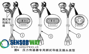 大部分壓力傳感器無(wú)法通過(guò)測(cè)量電阻的方式來(lái)判斷好壞, 而是需要在壓力傳感器工作時(shí)通過(guò)輸出的信號(hào)電壓來(lái)判斷。因此在檢測(cè)壓力傳感器時(shí)需要專用的檢測(cè)導(dǎo)線, 保證傳感器正常工作的同時(shí)將3條線引出供檢測(cè), 不同的壓力傳感器需要不同的檢測(cè)導(dǎo)線。圖6為3種不同的壓力傳感器測(cè)試插頭。