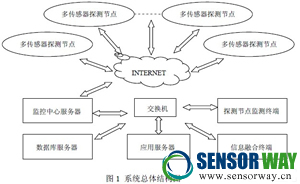 整個(gè)分布式多傳感器信息融合系統(tǒng)由若干個(gè)不規(guī)則分布的多傳感器探測(cè)節(jié)點(diǎn)、 INTERNET 網(wǎng)絡(luò)、監(jiān)控中心服務(wù)器、交換機(jī)、數(shù)據(jù)庫(kù)服務(wù)器、應(yīng)用服務(wù)器、多傳感器信息 融合終端和探測(cè)節(jié)點(diǎn)控制終端等組成,其總體結(jié)構(gòu)如圖1 所示。