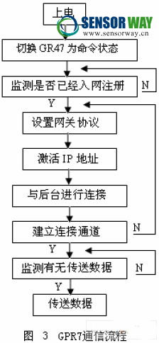 本系統(tǒng)采用了第二種方式獲得本身 IP,而后臺(tái)監(jiān)控中心 服務(wù)器的IP 是固定的。采用GPRS 模塊上網(wǎng)時(shí),GPRS 模塊 首先完成撥號(hào)登陸,然后進(jìn)行數(shù)據(jù)傳輸。實(shí)現(xiàn)動(dòng)態(tài)IP 方式 上網(wǎng)通信的處理流程如圖3 所示。