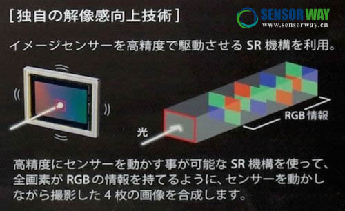 理光的移動傳感器技術(shù),讓傳感器上、下、前、后各移動一個像素的位置,拍攝4次,這樣每一個像素就包含了全部RGB數(shù)據(jù)。最終照片的像素還是傳感器本身的像素數(shù),但是得到的是沒有經(jīng)過插值猜色的更高質(zhì)量照片。